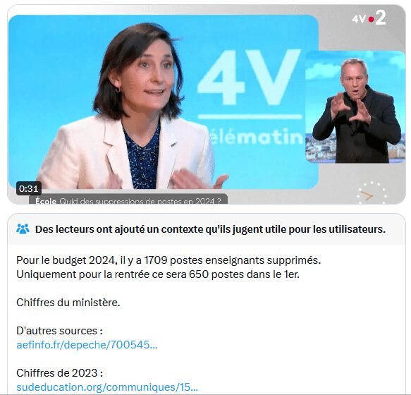 La Ministre Oudéa-Castéra a été l’invitée des “4 Vérités” de Télématin ce 17 janvier 2024. Interrogée sur les inquiétudes exprimées par les enseignants et les syndicats quant aux suppressions de postes prévues pour la prochaine rentrée scolaire, elle a catégoriquement nié l’existence de ces suppressions. Selon elle, Gabriel Attal, le Premier Ministre, a pris la décision d’annuler ces suppressions dans le cadre des arbitrages liés à la loi de finances 2024.