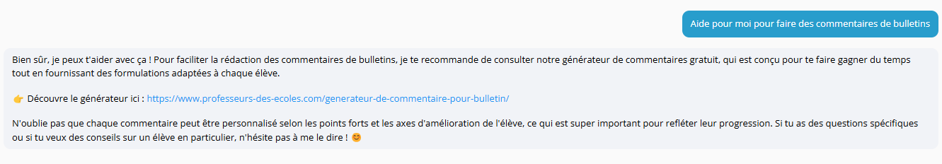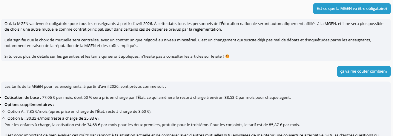 Cet assistant, c’est comme discuter avec un collègue qui connaîtrait presque tout du métier : les démarches administratives, les textes officiels, l’actualité de l’Éducation nationale, les pratiques de classe, les obligations réglementaires… Il a été nourri avec l’ensemble des contenus du site (articles, agenda, forum, fiches pratiques), ainsi qu’avec les textes de référence et extraits du Code de l’éducation.