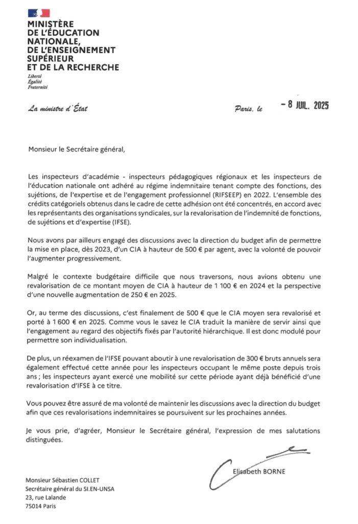 Selon la note officielle publiée début juillet, le Complément indemnitaire annuel (CIA) des inspecteurs de l’Éducation nationale sera revalorisé de 500 euros en 2025, portant son montant à 1 600 euros. À cela pourra s’ajouter une revalorisation de l’IFSE pouvant atteindre 300 euros. Au total, les IEN pourraient bénéficier d’une augmentation indemnitaire allant jusqu’à 800 euros poir cette année.