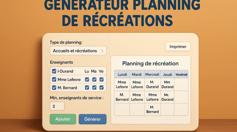 Organiser les services de récréation est souvent un vrai casse-tête pour les équipes de direction. Qui est de service ? Quels jours ? Comment équilibrer les présences ? Pour faciliter ce travail, le site professeurs-des-ecoles.com propose désormais un générateur automatique de plannings de récréation, simple, rapide et entièrement gratuit.