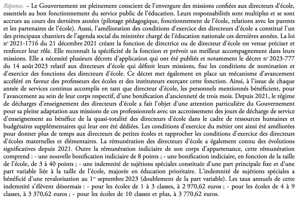 Dans sa réponse officielle, le ministère reconnaît l’ampleur et la complexité du rôle des directeurs d’école, mais rappelle que plusieurs mesures ont déjà été mises en place ces dernières années. La création d’un véritable statut de directeur ou directrice d’école par la loi du 21 décembre 2021, ainsi que ses décrets d’application publiés en 2023, ont permis selon lui d’améliorer les conditions d’exercice de la fonction.