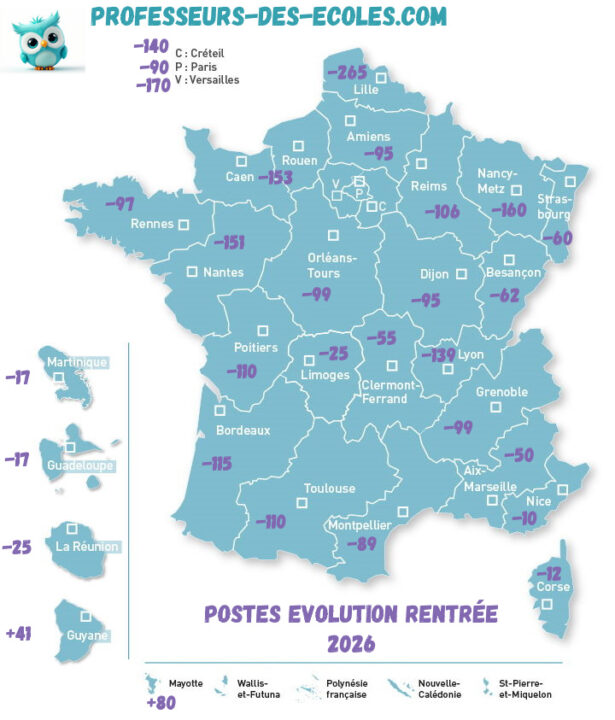 👉 Carte de France montrant les postes supprimés ou ajoutés par académie dans le premier degré.