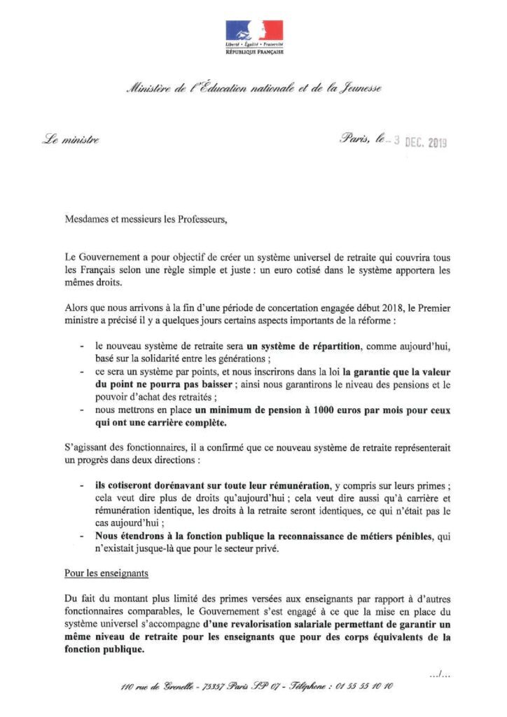 Le ministre a envoyé ce mardi 3 décembre 2019, deux jours avant la journée de mobilisation, un courrier à l’attention des enseignants concernant la réforme du système de retraites.